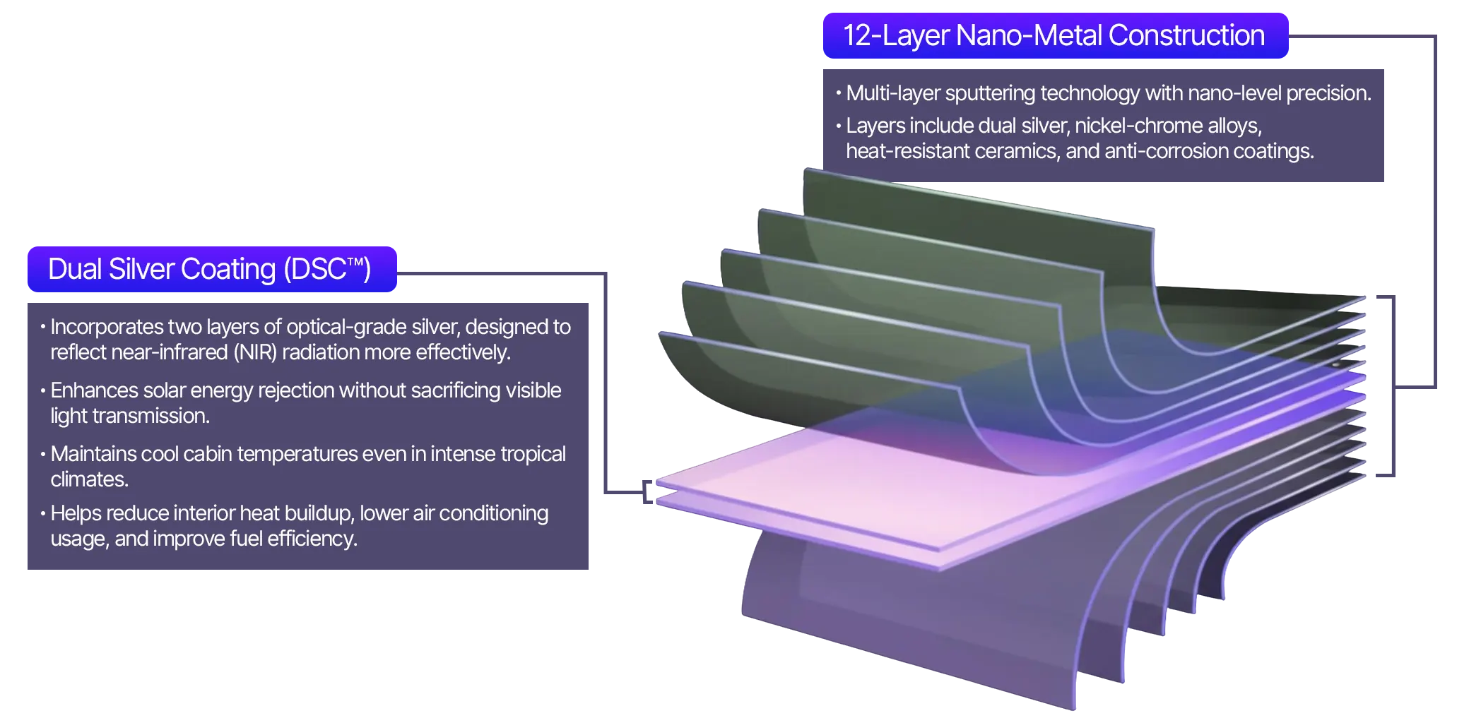 Lumi Argentum 12-Core™ represents the pinnacle of automotive window film engineering. Designed for premium automotive applications, this film incorporates a revolutionary 12-layer metal nano-coating structure, with dual silver technology at its core, delivering exceptional heat rejection, crystal-clear optics, long-term durability, and aesthetic elegance.